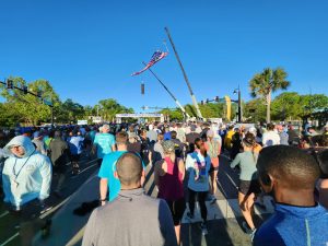 On race morning we woke up at 0-dark thirty to get on a school bus that would shuttle us off to the start in the city of Mount Pleasant (named for an old plantation—the Low Country is as flat as it gets). A procession of buses took off from our departure area as well as three other areas delivering nearly 27,000 runners and walkers to the starting area. The race’s motto is, “Get over it!” A nice play on moving over that bridge. For many runners it’s an annual passage to get over it! And for many others—including us—it would be the first time we get over it! My son soon got over the fact that he was tired and cold once we all got moving!