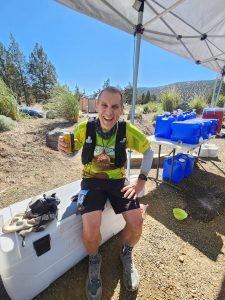 Now about that bandana—it was used to wrap ice around my neck at each aid station. And I liberally stuffed ice in my hat too—all to fight any chance of overheating. And in tandem with keeping cool is staying hydrated. I started drinking copious amounts of water before the race began and I made sure at every aid station to not only fill my flasks, but to down serious amounts of water and before heading out. A Sports drink is important too to avoid electrolyte depletion and cramping. I started taking electrolytes before the race in both liquid and tablets—and I made sure that the foods I ate before, during and afterwards were rich in potassium. Potassium fuels muscles, and I’ll need plenty of fuel to run 50 kilometers in mountainous terrain in Oregon’s High Desert. Bananas and potatoes are two of the best natural sources of potassium and I have them every race morning and throughout the race at the aid stations. Banana and orange slices as well red potatoes all go down pretty fast and easy when I am on the run. Post-race I usually indulge in potatoes as well although not usually in their healthiest form—but after running an ultra I can lighten up on the diet. Instead of fries I had potato salad after this race and it hit the spot!
