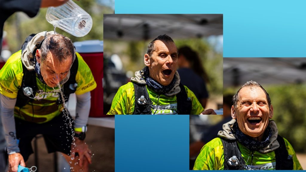 Of course I adjust my pace on hot days too. I try to run faster before it heats up—although this race didn’t give us much of a window with its fairly later start and lack of shade from the start. I adjust my pace in the heat striving for a decent pace without overheating. I did run into a little trouble halfway on a long four mile ascent with no shade. I was getting light headed. I made sure as soon I got to the aid station to immediately cool down. The volunteers there including my friend and veteran ultra-runner Wendy did a great job dousing my head with cold water and stuffing my hat and bandana with ice. They made sure too I was getting rehydrated. After about 15 minutes of recovering (and thinking about the irony of spending lots of time at an aid station at my last ultra trying to warm up and dry out) I was on my way again. I was able to hold a pace for a respectable finishing time. And in this race in which my friend Wendy told me there were many causalities on the course from the heat, all of us who finished did well! I also took pride in seeing that I was the oldest finisher! There were only 3 of us over 60 who completed the race. Heat definitely becomes more of an issue as you get older, another concern we older runners have to address in this challenging but oh so reward world of ultra-running!