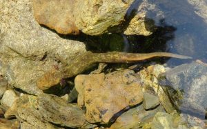 On my recent hike to Sundown Pass, I witnessed one of these critters in the headwaters of the South Fork Skokomish River in a high basin at about 3300 feet. It blended in quite well with the rocky bottom of the clear mountain creek—its preferred habitat. Most of the time they are submerged under rocks during the day—but this one was freely swimming about in broad daylight. If you grew up in the south they look a lot like mudpuppies.