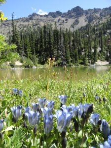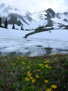 So that’s what the small tarn in the upper Royal Basin looks like–and wow is it beautiful! Last week I returned to the Royal Basin in Olympic National Park. It had been 9 years since I had hiked to this rugged beautiful hanging valley in the northeast corner of the Olympics. In 2006 I made the hike in early July. This year I made the trip in mid-July. It was a completely different hike due to the difference in snow cover. While the upper lake covered in snow and surrounded by large snowfields certainly had a wild and rugged beauty–seeing the lake’s blue green waters at the base of glacial moraine on a bluebird day was spectacular. The slopes leading to the basin were verdant and speckled with flowers this time too. Last time–snow! And all of the flowers were on an accelerated blooming schedule. The gentians were already in full bloom.